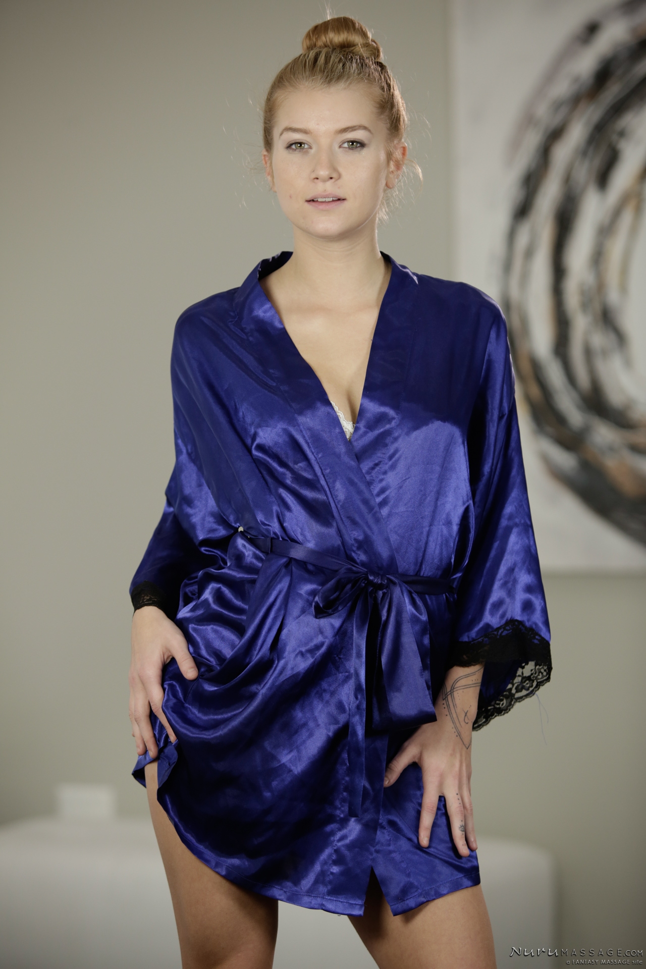 Photos description: Student Codey Steele is swamped with school work and cramming for exams during Spring Break. While dodging plans with his buddy and complaining about his inordinate stress, his friend suggests a soothing massage, so he takes his sound advice. Later at the spa, dirty blond masseuse Arya Fae welcomes him in a skimpy satin blue robe. He describes his predicament and the energy beverages he's been guzzling to cope with his workload. Arya understands, she's a student too. But she wants him to try something healthier. He follows the sexy girl into the massage room, all ready with a NURU mat. She sensually slips off her robe and sexy lingerie, then she gets Codey undressed. Naked, she slathers the NURU gel onto his back. She climbs aboard and slides along his back. She turns him over and swallows his cock with her hungry pussy. He takes her from behind, and fucks her till she cums. Then he sideloads her pussy and shoots his load all over her muff.