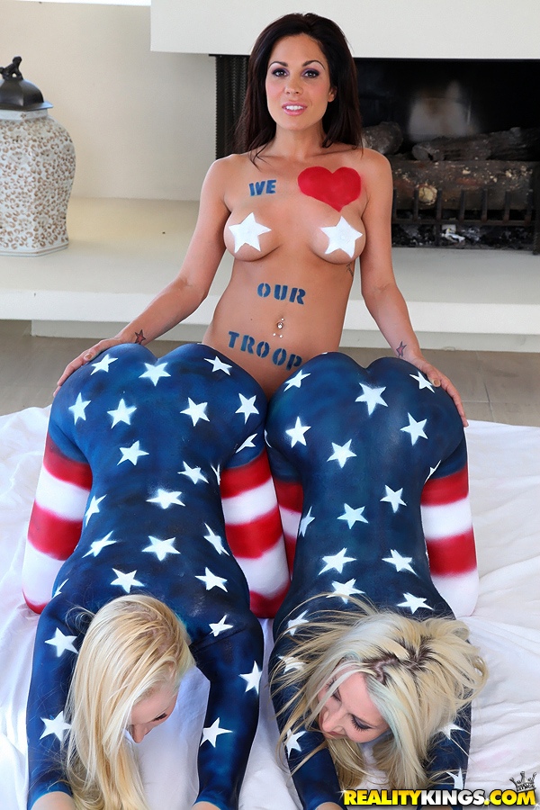 Photos description: In appreciation of the great feat the troops have accomplished, Sammie, Lux and Kirstten had a patriotic theme painted on their sexy bodies. After addressing the brave troops, the girls took the celebration indoors. Sammie, Lux were uninhibited, licking and tongue fucking each other until they each had multiple orgasms.