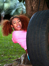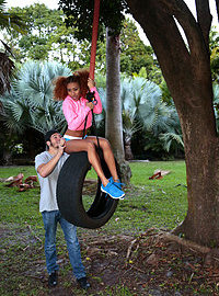 Photos description: Kendall Woods was outside swinging on a tire, looking very sexy in those tiny shorts. Her boyfriend, Bambino, came over and began pushing her on the tire swing. Soon after, he began feeling up her juicy rump and she was loving it. Not too long after that, she was sucking and fucking his cock. She got her pussy drilled on the tire swing. They heard her Dad calling her so they ran off and climbed up on a tree. They continued to fuck up in the tree. They climbed down and she got that man juice all over her pretty face. Her Dad caught her with cum all over her face and sent her to her room.