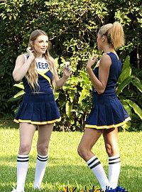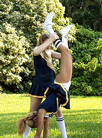 Photos description: Amber Gray and Selena Sosa were practicing their cheerleading routines. They started to practice hand stands. Selena did a hand stand as Amber held her legs. Amber got a good look of the outline of her pussy through her panties. Next, while Selena was busy, Amber took off her panties and hid them. She pretended to have a cramp and asked Selena to help her stretch her out. Amber opened her legs and Selena noticed she had no panties on. Selena was aroused and Amber asked her to touch it. They played with each others pussies and soon after, they were inside the house, fucking each other with their pom poms. They sat on each others faces and it was a great practice.