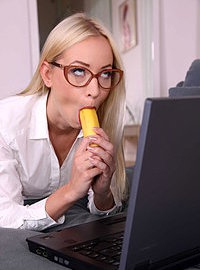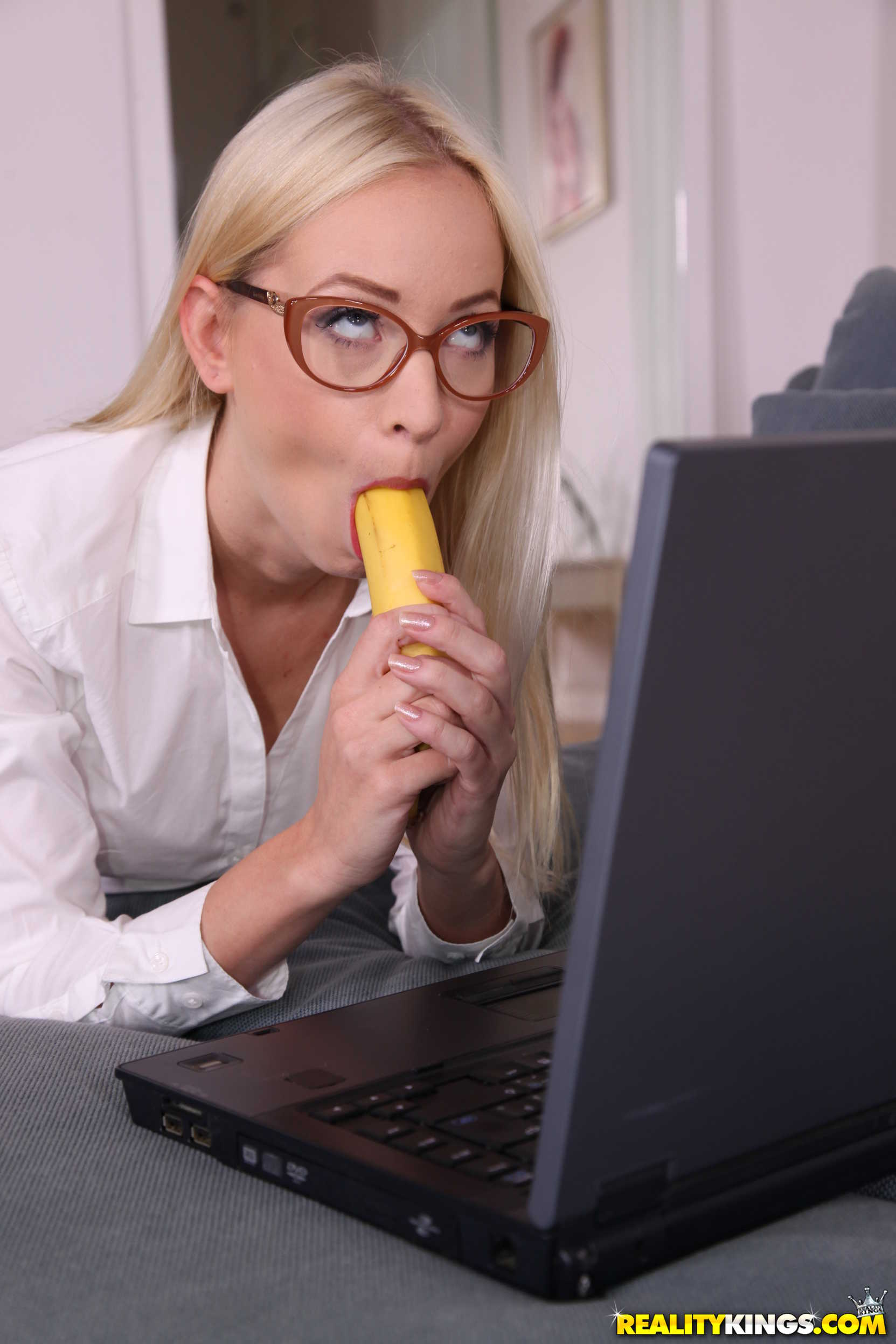 Photos description: When the house is quiet, babysitter Kiara decides to indulge her curiosity about deepthroating with a banana, but the blonde teen is embarrassed when sexy MILF Kayla comes home early and catches her in the act! Kayla surprises the babysitter when instead of a lecture, she offers a lesson in cock-sucking instead. And who better to practice on than Kayla's husband David? The silver fox is more than happy to take the two gorgeous blondes up on their offer for an amazing blowjob where they take turns deepthroating his dick and sucking his balls. Once Kiara feels like she's got the hang of it, she climbs on top of David to ride his thick cock, and Kayla wants a turn, too!