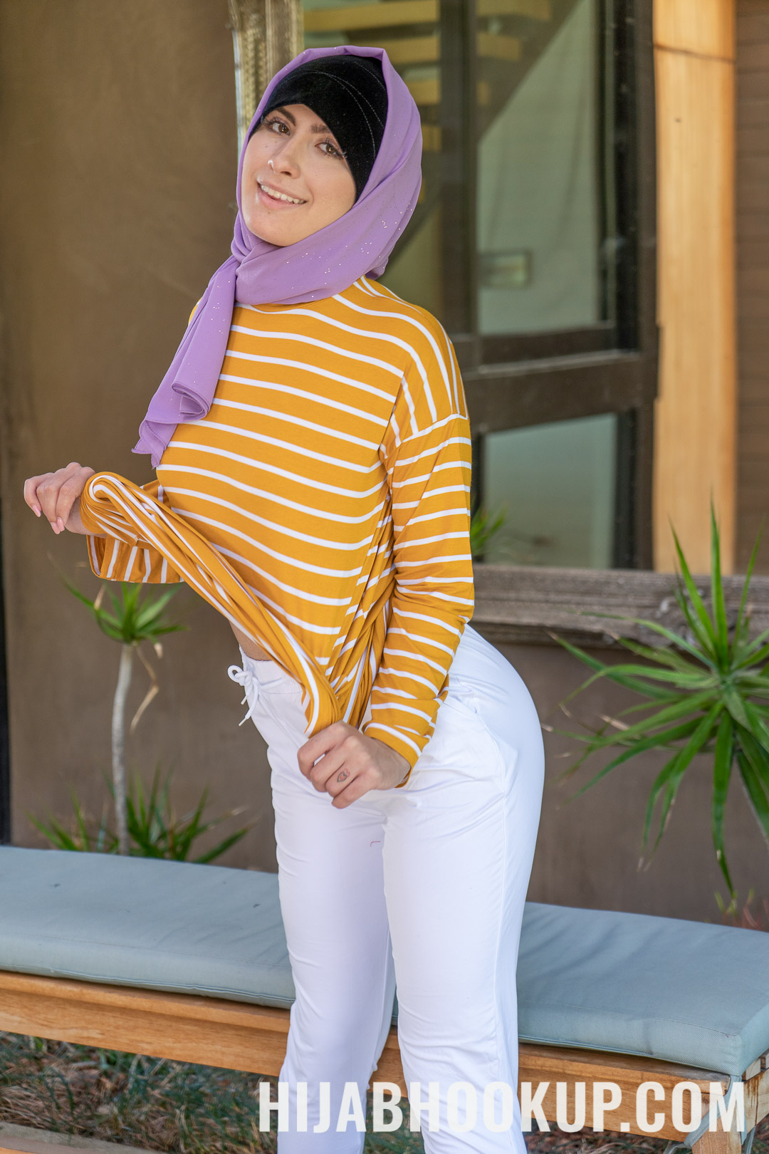 Photos description: Middle eastern babe Angeline Red tells Donnie Rock that she tried out for the dance team and got in! Donnie tells her to do a spin and notices that she’s not wearing any underwear so he suspects that might be how she got into the team. Angeline is so happy that she tells Donnie she’s been watching porn and now feels ready to go all the way with him! Angeline will end up completely naked, the hijab stays on though!