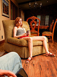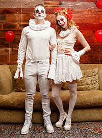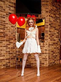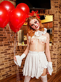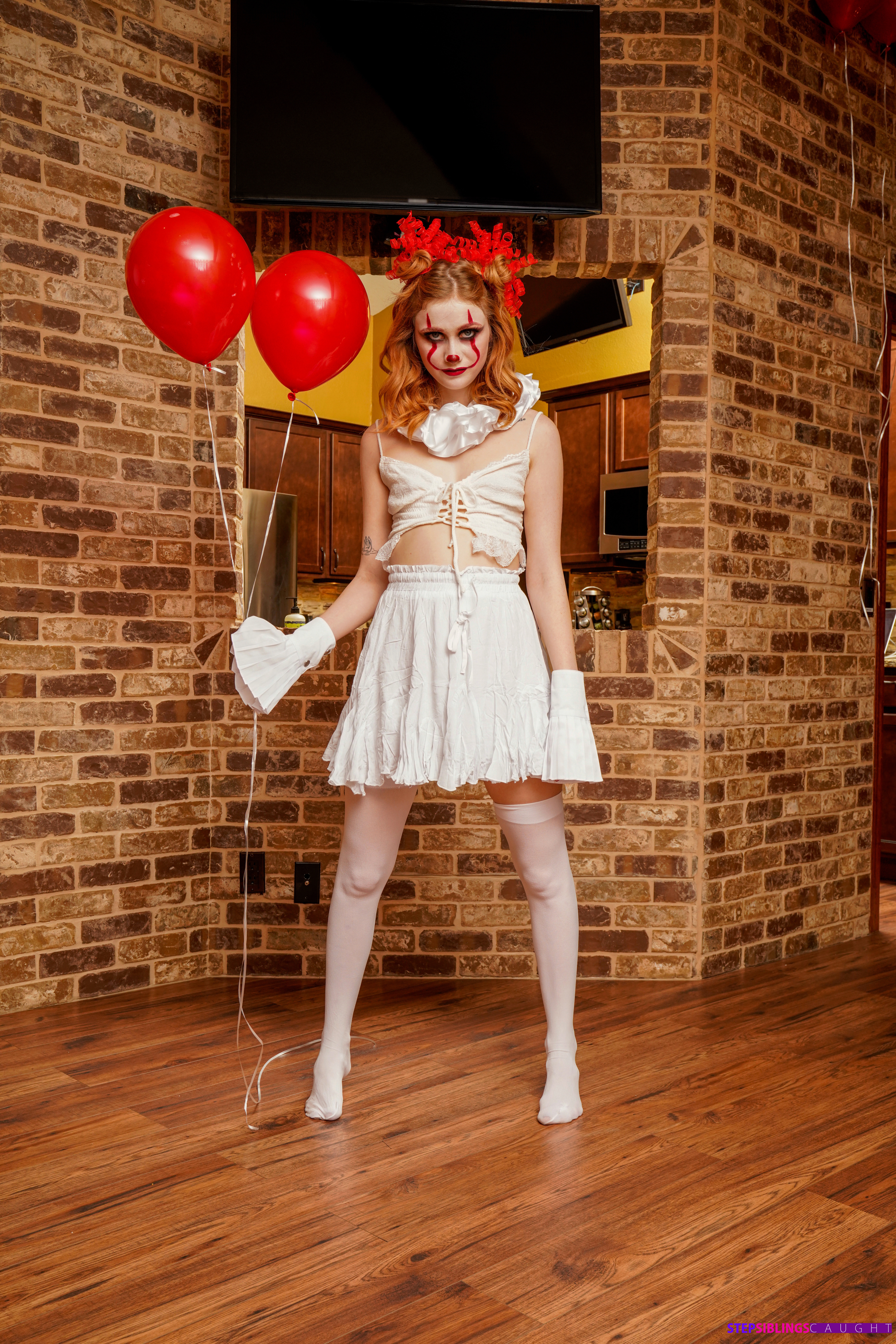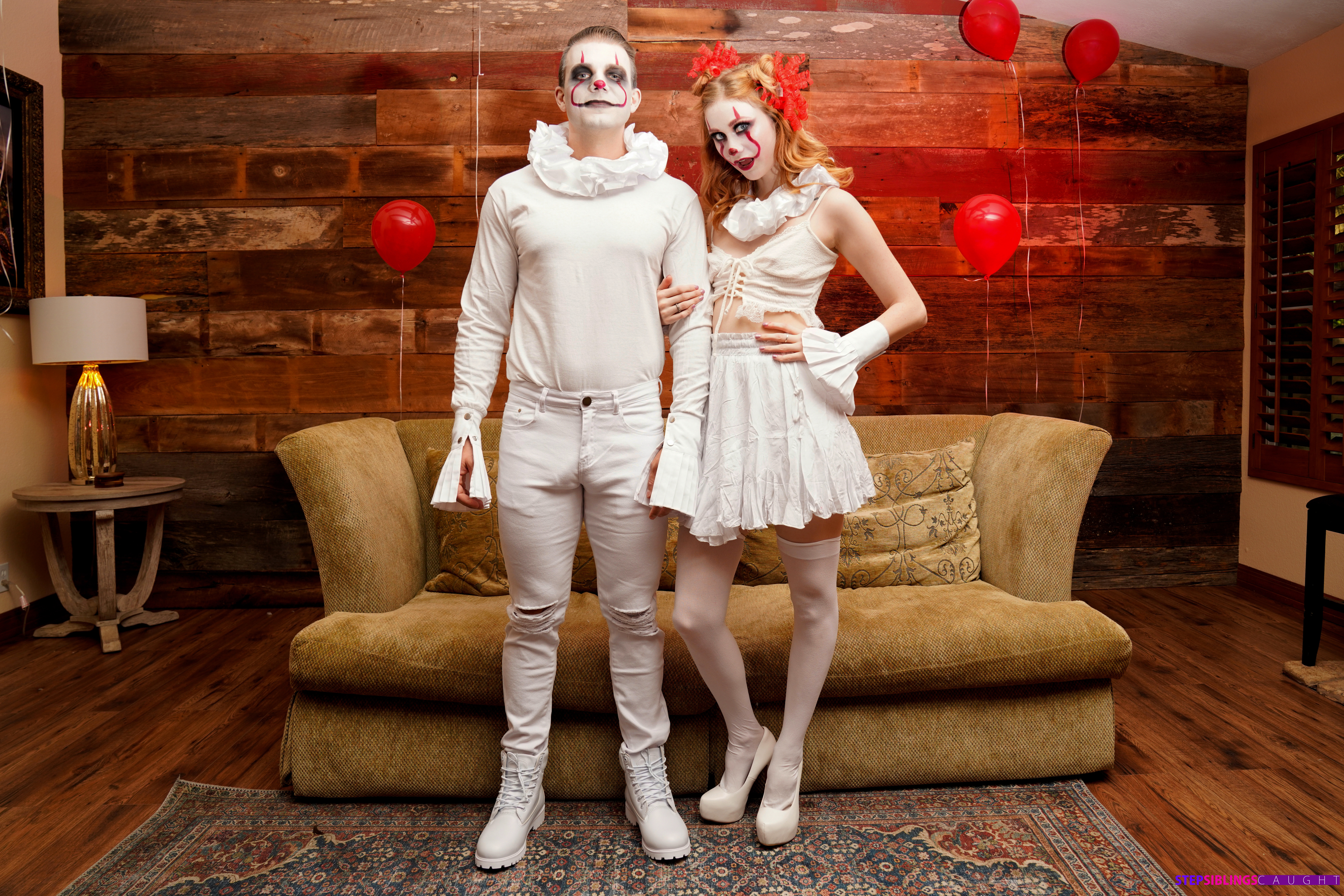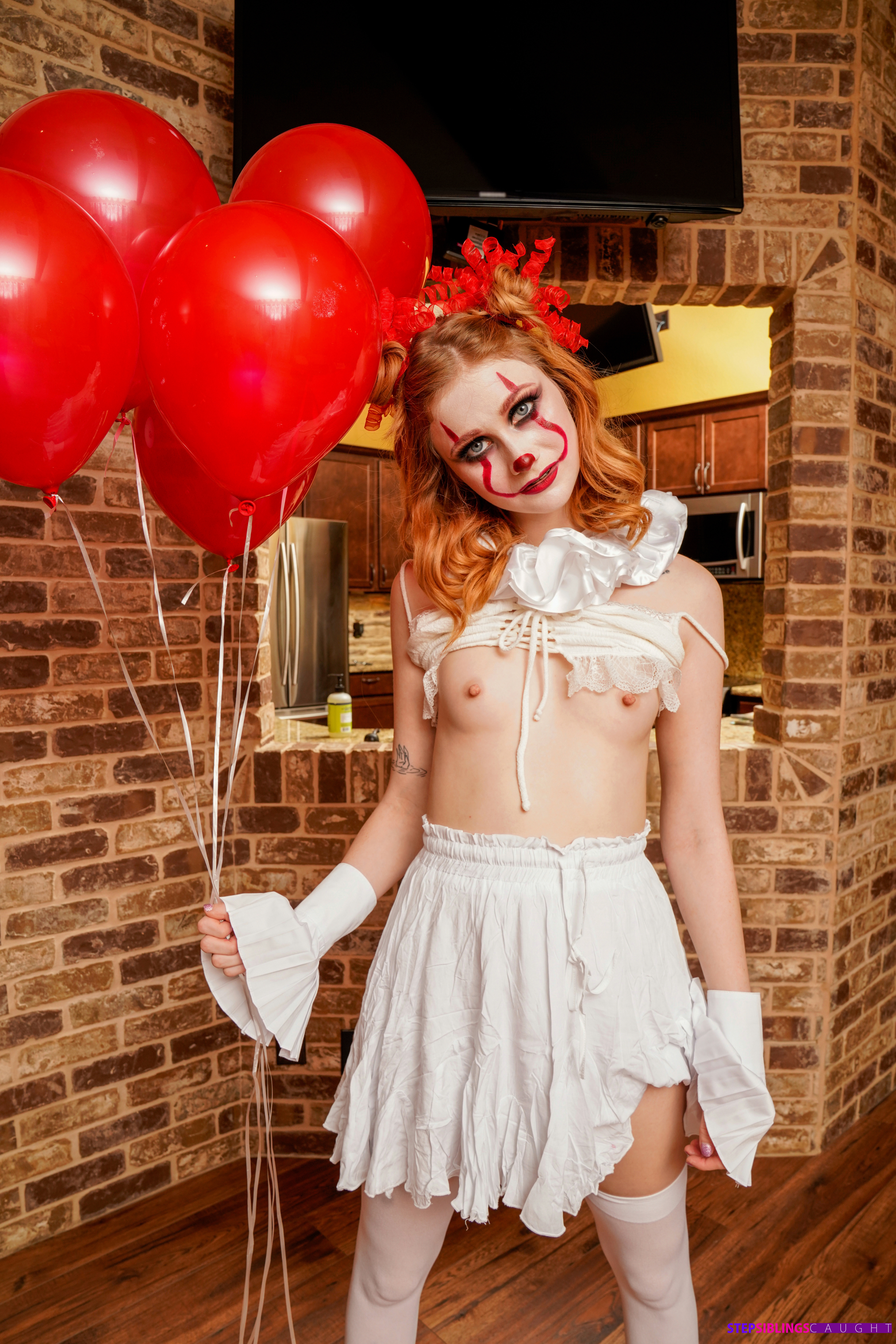 Photos description: Codey Steele and his dad have just moved in with Scarlet Skies and her mom. Codey and Scarlet have not really figured out how to coexist comfortably yet, but with Halloween just around the corner at least they have something to talk about. Scarlet wants to dress as a famous evil clown, but Codey poo poos her idea. Taking off in disgust, Scarlet puts on her sexy clown costume and then tries it out on her new stepbrother. Codey doesn’t seem phased with Scarlet’s initial appearance, but Scarlet isn’t done being a total creeper yet. She follows him around the house with her red balloons, making sure he catches peeks over her but not for long enough to be sure she was really there. When Codey lays down for a nap, Scarlet crawls on top of him and just stares down. Codey wakes up to a spooky clown face staring right at him. Once her stepbrother sees her, Scarlet comes on to him hard. She grabs his hand to drag his fingers through the slit of her pussy, then tugs his pants down to go to work sucking him off. Codey wasn’t looking for sex with his brand new stepsister, but Scarlet insists. She crawls up his body and sinks down onto his fuck stick to rock her hips and ride him in a rhythm that quickly gets her moaning. Codey eventually sits up and helps Scarlet as she slides back on top of him, this time with her back to his chest. When she climbs off and gets on her hands and knees in an invitation for Codey to do some of the work, he takes her up on it. Getting to his knees, he slams home into Scarlet’s cock loving snatch and goes to town giving it to her in doggy. Scarlet loves the way her stepbrother fucks and she demonstrates her excitement by rocking back into every one of Codey’s enthusiastic thrusts. When Scarlet rolls onto her back, the horny redhead brings her knees up to her chest to spread herself wide open so that Codey can go to town eating her out and then replacing his tongue with his cock. Codey is so wound up he can’t stop until he has delivered a deep creampie into Scarlet’s hot little twat, a Halloween treat that she loves to lick off her fingers.
