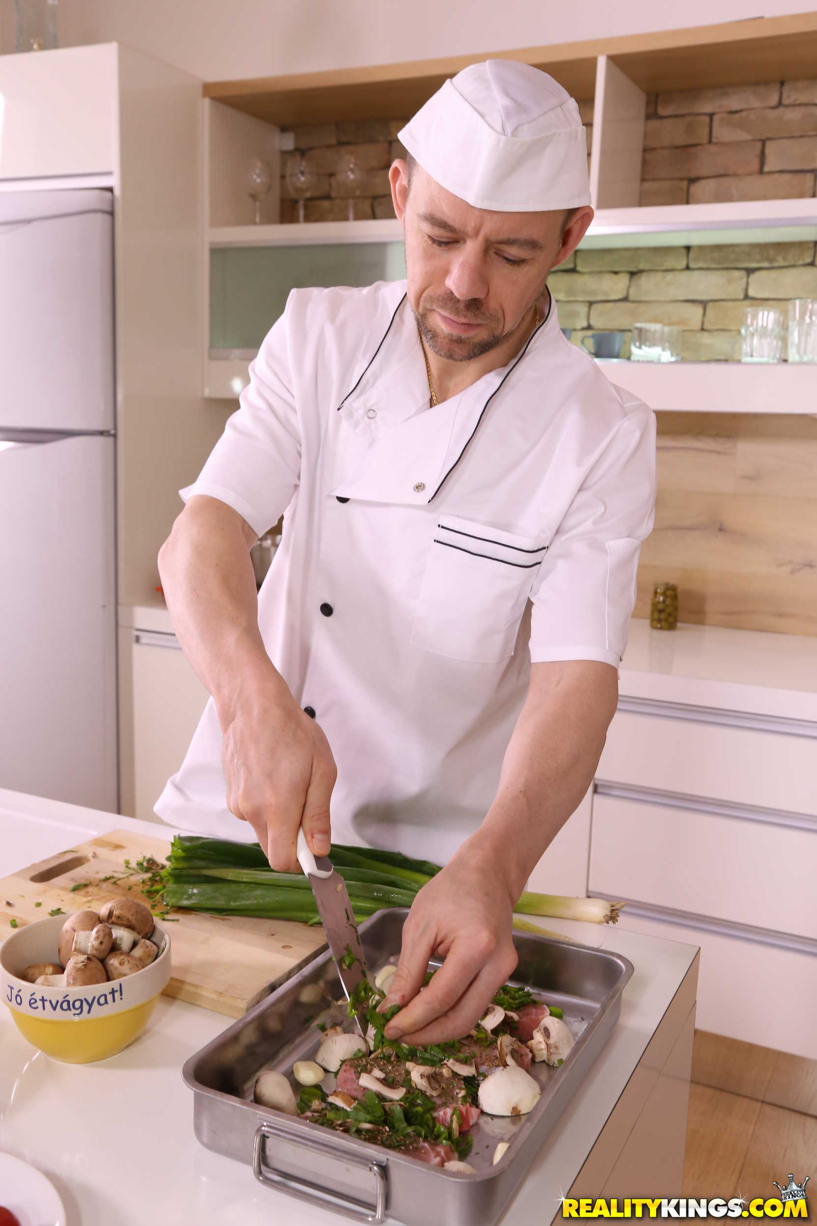 Photos description: Wealthy honey-haired Misha Cross and her husband are holding one of their affairs later, and the regular cook had the nerve to take the night off, so they’ve hired hunky caterer Erik Everhard to fill in. Spoiled Misha doesn’t know the first thing about cooking, but that doesn’t stop her from making a pest of herself, giving Erik orders and getting in his way. Maybe Misha is provoking him because she wants sex served hot while her husband isn’t looking. Erik has had enough, so he spins this bossy babe around, pulls up her little black dress, tears her panties aside, and fucks her doggystyle. Then she drops to her knees to give him a blowjob and sneak a taste of his secret sauce while her husband stands nearby, oblivious. And for dessert Erik whips this cheating wife up a creampie surprise… the chef’s secret: he serves it up anally!