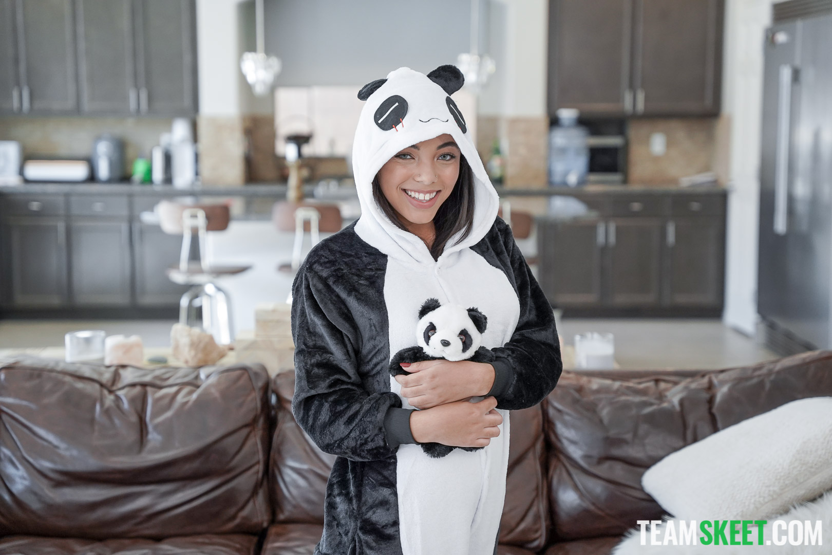 Photos description: Zerella Skies and her puppet pal panda are having a wonderful time wandering around the house, getting into all sorts of hijinks. But when she involves Quinton James in the games, he is less than impressed. Later, Zerella hides in the closet and surprises Quinton with a love tap from her puppet pal. Slightly aroused, Quinton and Zerella give the puppet pal panda a show it will never forget.