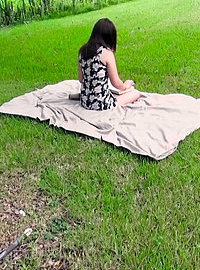Dark haired minx with natural tits gets double penetrated outdoors