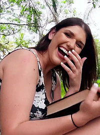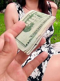 Photos description: April Dawn from Albany, NY was in the park reading a book and waiting for her boyfriend when I happened along with my camera, my cash, and my cock, of course. This girl was so flirty with her cleavage and legs spilling out of her tiny tight minidress – she was talking about sex before I even knew her name! She told me she gets off on the chance of being caught or people watching her fuck, and I could tell by the way she was rubbing her pussy through her red lace panties she was down to make some cash sucking my dick. She plucked my prick from my shorts and stuffed it down her throat right in the park, and after facefucking her, all she wanted was to take out her big natural titties and let me fuck her tight pussy. With April face down and ass up, we had some deep doggystyle in the grass while this sexy brunette moaned on my cock. What will her boyfriend say when he sees I busted my nut all over her pretty face?