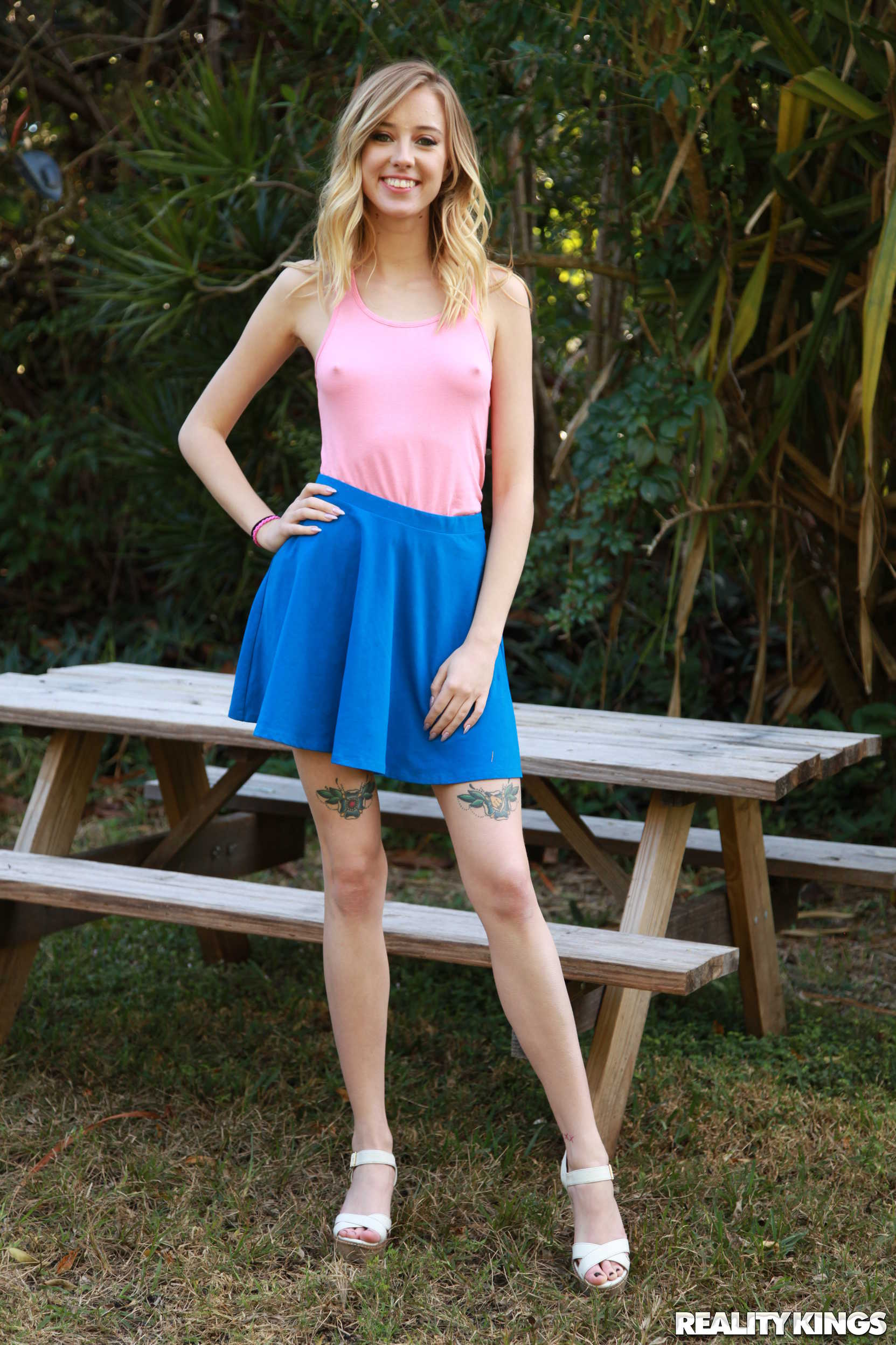 Photos description: Naughty girls Evelin and Haley are up to no good, running rampant around town and getting nasty! These troublemakers are doing everything from making out in public to flashing their tits and asses at any guy in sight. The slutty gals dare each other to even nastier heights, until they finally get so turned on they need to find a bit of privacy so they can really get up to some trouble. Even at a quiet spot in the park, a local perv watches Haley eat Evelin's pussy until the babes chase him away when Evelin squirts all over him! The babes just keep cumming, licking each other's clits and scissoring, and Haley even tongues Evelin's asshole!