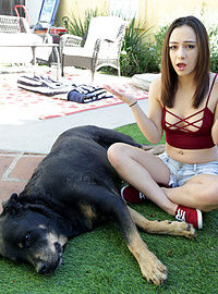 Movie description: Lily Jordan is a perfect tenant in every way but one: she's breaking her building's no pets rule! Building manager Chuck comes to warn her either her pup needs to go or she does, but Lily has a better idea, getting on her knees and begging for his big cock in her mouth! Naturally, this brunette babe loves to do it doggystyle, and she laps up Chuck's cum.